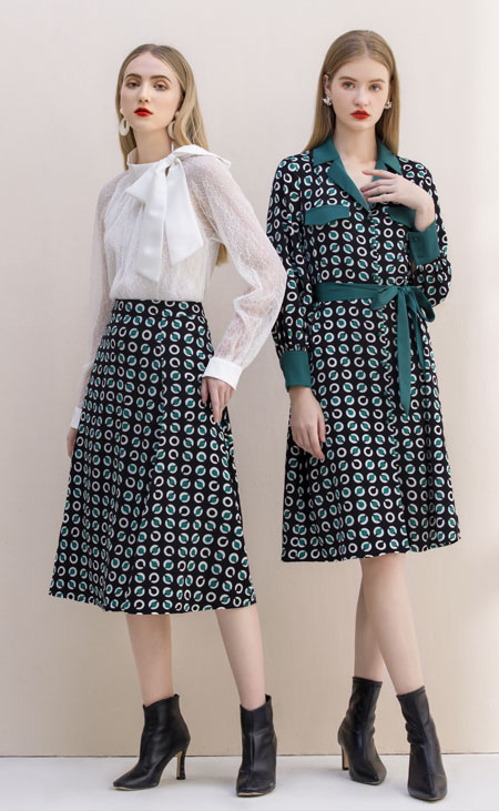 时尚又新颖的绿心可可豆型波点印花装饰,在版型裁剪上凸显东方美人纤细的腰身,别出心裁的印花让整体服饰清新又不乏时尚感,集合了典雅的欧美风格与东方女性的气质相融合,让人见之而难忘。