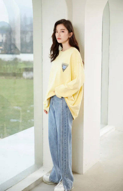 展示你的悠然自得和青春洋溢。后背的印花是讲述着一个故事,主角的星际恋爱主题,做了老电影的效果,给秋日带来奇幻与浪漫的故事。宽松小A摆卫衣,满地印图案是 BONNIE系列,搭配牛仔裤,清爽休闲,或搭配百褶裙,青春洋溢。黄色上镜肤色衬白,人群中就是C位的存在!