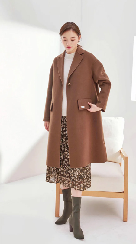 焦糖巧克力,浓郁非常特色,透露着低调的精致感,温暖有层次,恰到好处的气息。西装领双面呢外套,版型简洁大气,搭配一款简洁毛衫和印花半裙,整套搭配展现了职场利落,又不失优雅韵味的装扮。